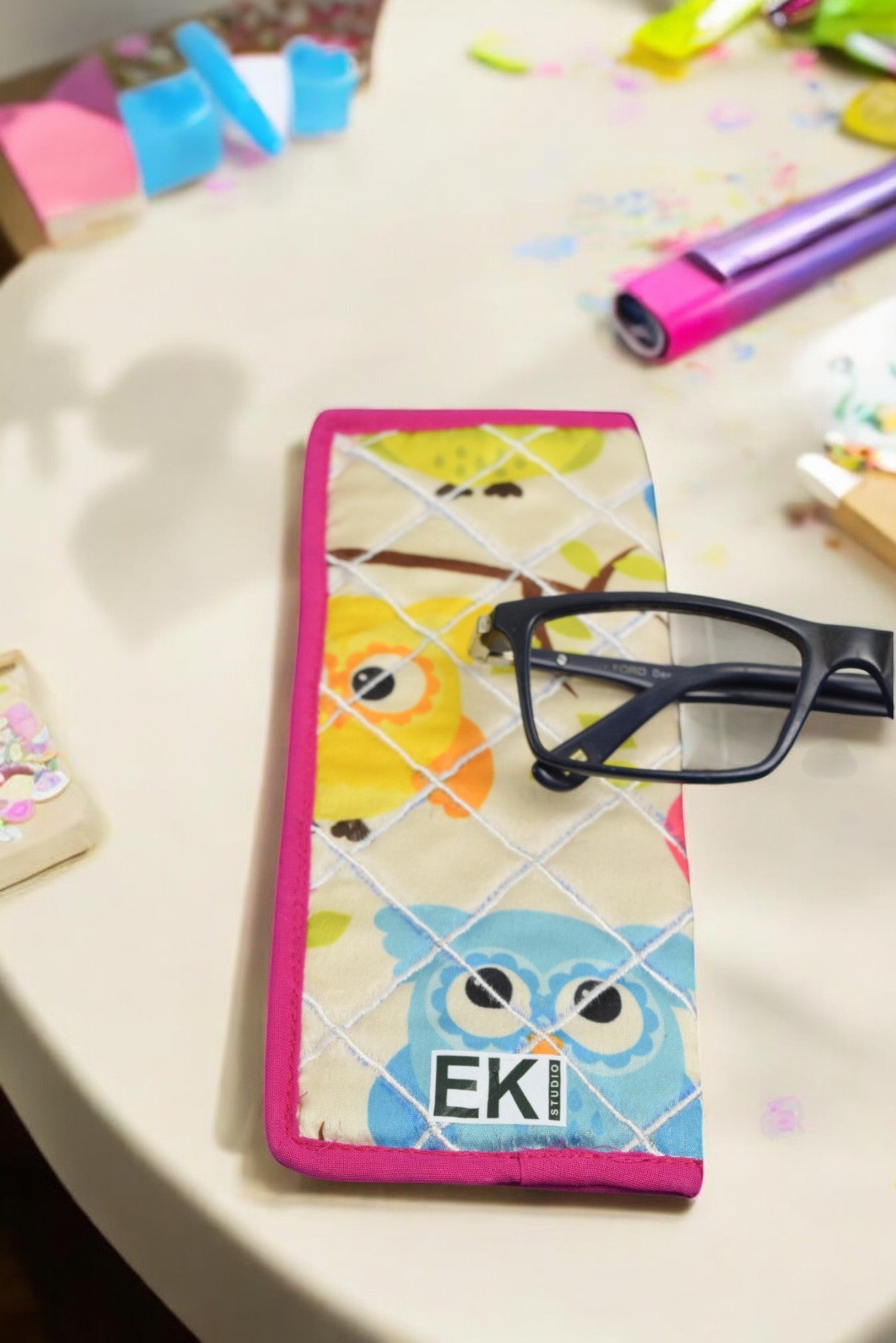 Keep your glasses safe in style with this handcrafted owl-themed eyewear case! Featuring adorable owls perched on a tree, this vibrant multicolor design adds a fun and quirky touch to your accessories. The magenta border enhances its lively appeal, making it perfect for those who love cute and creative designs.